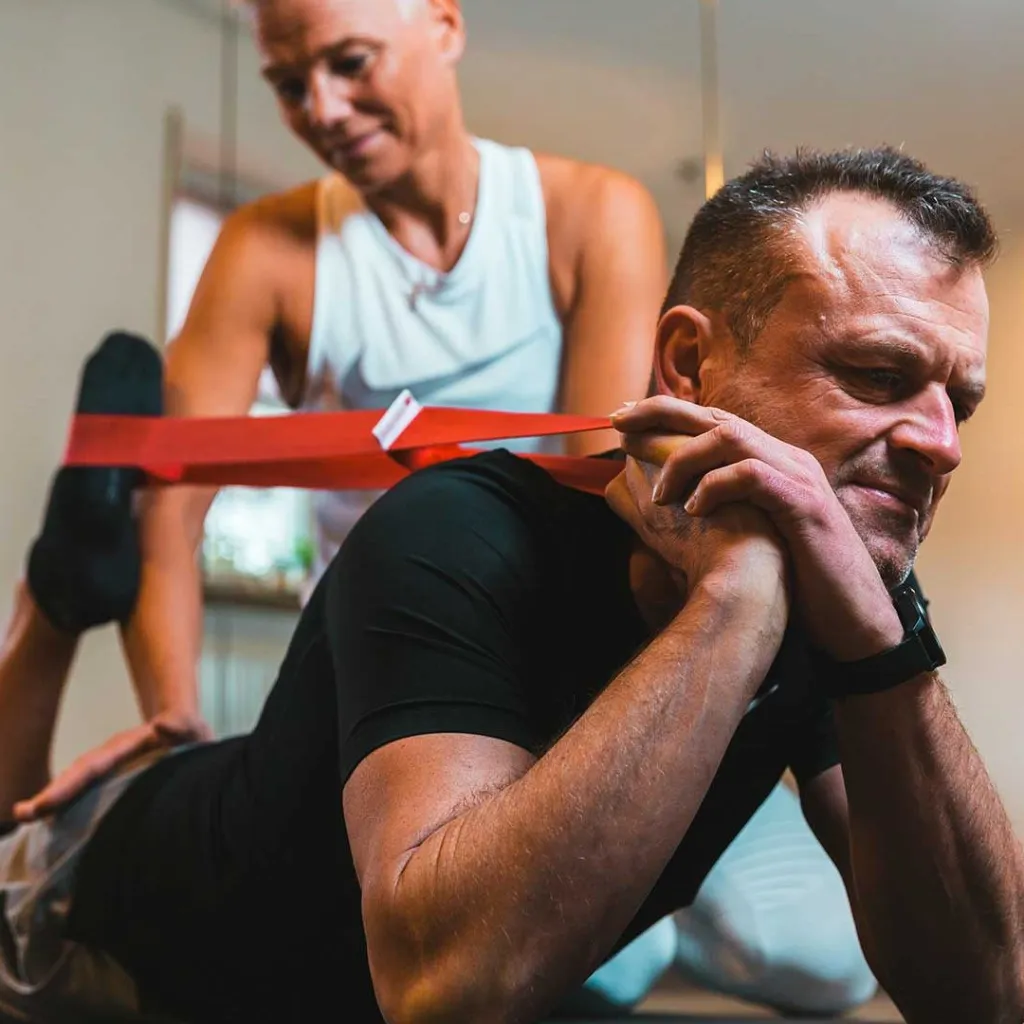 An seiner Seite: Jessi, die dich mit Yoga, Achtsamkeit und Power-Einheiten begleitet.